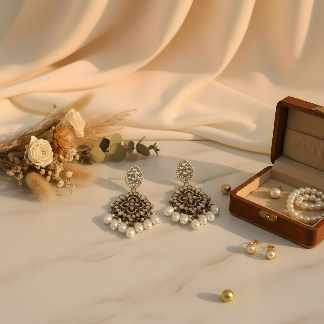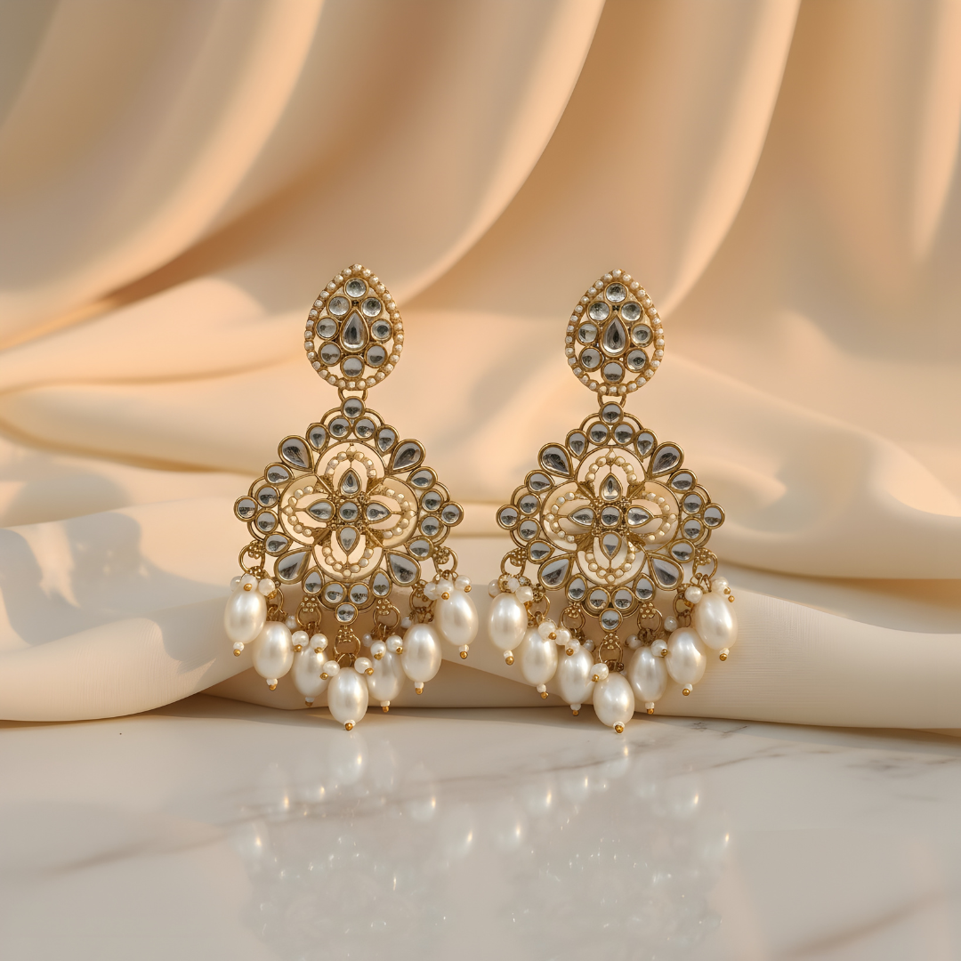 Add a touch of timeless elegance to your ethnic wardrobe with these Traditional Kundan Pearl Chandbali Earrings for Women. These stunning earrings are artistically handcrafted with high-quality kundan stones and premium pearl drops, giving them a luxurious and royal appearance. Designed with precision, the earrings feature intricate detailing and a rich gold-plated finish that enhances their charm. The sparkling stones beautifully reflect light, making them a perfect statement accessory for bridal wear, festive celebrations, and cultural events. Despite their elaborate design, these earrings are lightweight and comfortable, making them ideal for long hours of wear during weddings, receptions, sangeet, haldi, mehendi ceremonies, and special occasions. Whether you’re a bride, bridesmaid or a wedding guest, these earrings add grace and sophistication to any traditional outfit. Pair them with sarees, lehengas, Anarkali suits, shararas, or ethnic gowns to complete your festive look. These chandbali earrings also make a thoughtful and elegant gift for your loved ones on birthdays, anniversaries, Raksha Bandhan, Diwali, Eid and other celebrations. Upgrade your jewellery collection with this classic pair of kundan pearl earrings and enjoy compliments wherever you go!