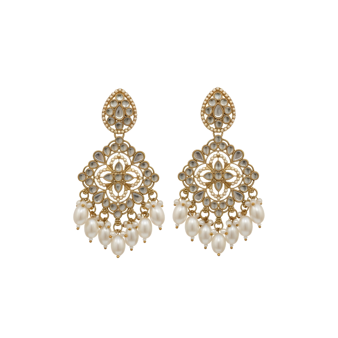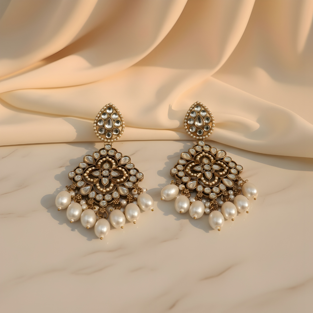 Traditional Heavy Look Kundan Wedding Earrings | Gold-Tone Traditional Polki Style Dangler with Pearl Earrings