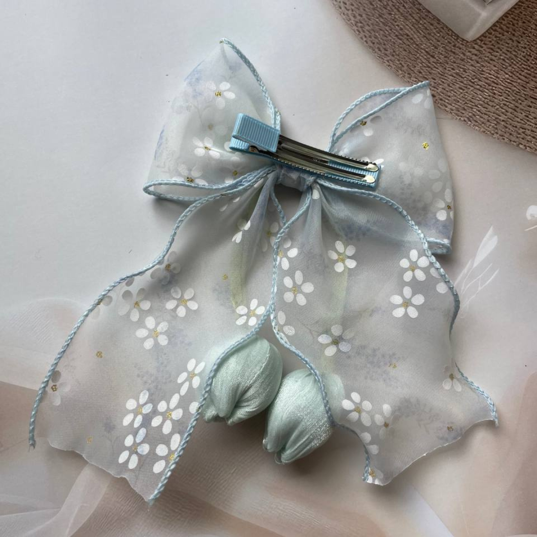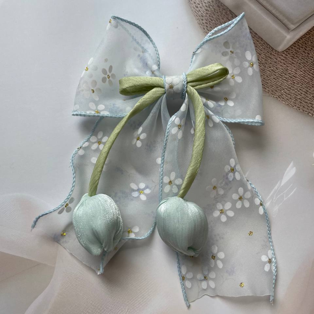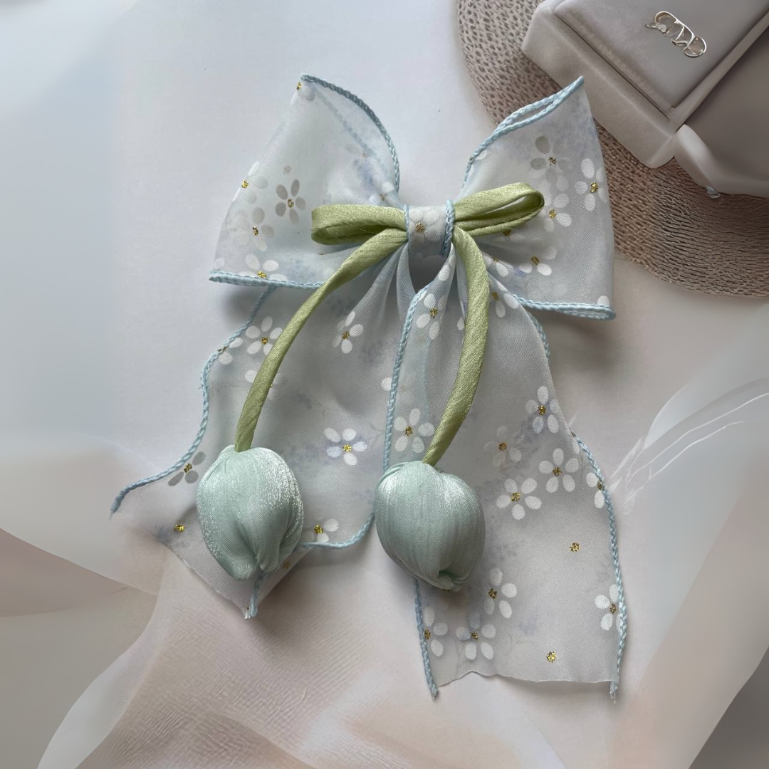Tulip Korean-Inspired Floral Hair Accessory – Elegant Bow Clip with Hanging Tulip Aesthetic Hair Claw (Blue)